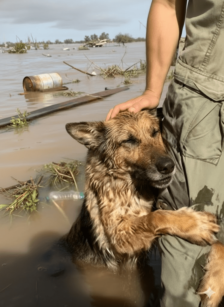 The floodwaters rose swiftly, turning familiar landscapes into treacherous, muddy expanses. Amidst the chaos and devastation, stories of resilience, bravery, and unwavering loyalty emerge. One such story is captured in a single, poignant image: a German Shepherd, its fur matted with water, clinging with a desperate yet trusting grip to the leg of its human. This isn’t just a picture; it’s a testament to the profound bond between humans and animals, a beacon of hope in the face of disaster, and a stark reminder of the countless lives impacted by natural calamities. As communities grapple with the aftermath of such events, the immediate instinct to protect and be protected by our animal companions often shines brightest. This dog’s eyes, filled with a mix of fear and relief, speak volumes about the terror it has endured and the comfort found in its rescuer’s embrace.