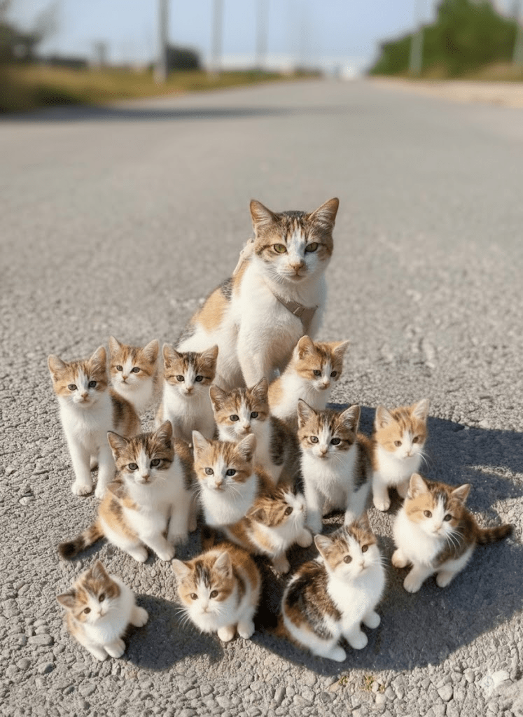 In the heartwarming image captured above, we witness a truly remarkable scene: a vigilant supermom cat, adorned with a tiny backpack, overseeing her delightful brood of nine fluffy kittens. This isn’t just a cute picture; it’s a testament to the incredible dedication and tireless effort of feline mothers, highlighting the universal themes of nurturing, protection, and the joyous chaos of a large family. Each tiny face gazes up with an innocent curiosity, their various tabby and calico markings a charming mosaic of feline beauty. The sheer number of kittens underscores the immense responsibility this mother cat bears, yet her posture exudes a calm attentiveness, a silent promise of unwavering care. This snapshot offers a rare and intimate glimpse into the bustling world of a feline family, reminding us of the profound bonds that exist in the animal kingdom and the endless wonders of nature’s design.