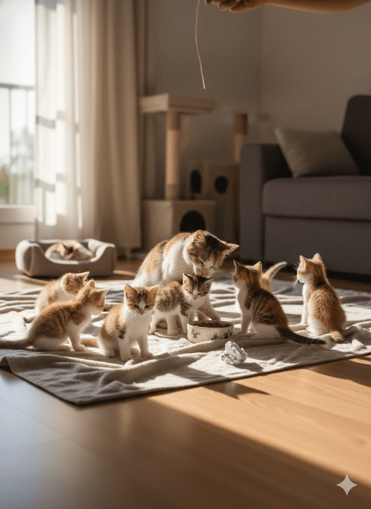 One can only imagine the daily routines of this bustling household. From feeding time to playtime, grooming sessions to naptime, every moment must be filled with a delightful blend of playful antics and tender care. The mother’s watchful eye ensures that each kitten receives the attention and protection it needs to thrive in its early days.