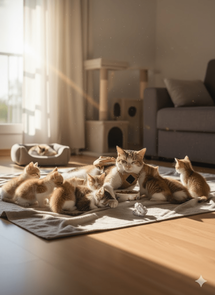The little backpack on our supermom adds a touch of whimsical mystery. Is it a fashion statement, a tiny emergency kit, or perhaps a practical way for her human companions to keep track of her during her important maternal duties? Whatever its purpose, it highlights the unique personality of this incredible cat, making her an even more endearing figure in this captivating family portrait.