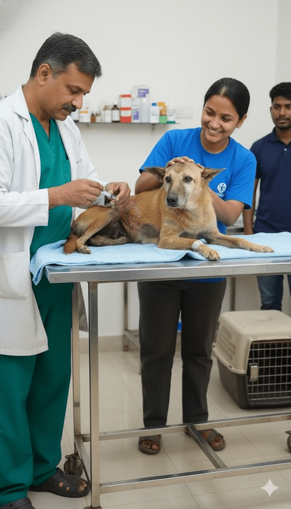 Once rescued, the journey to recovery begins. This often involves extensive veterinary care, including treating wounds, administering vaccinations, and addressing underlying health conditions. Many dogs are emaciated and require a specialized diet to regain their strength. Beyond physical healing, emotional recovery is crucial. These animals often carry the trauma of their past, requiring patience, gentle handling, and a safe environment to learn to trust again. The image shows the same dog, now on an examination table with veterinary staff, receiving professional medical attention, marking a critical step in its transformation from neglected stray to recovering patient.