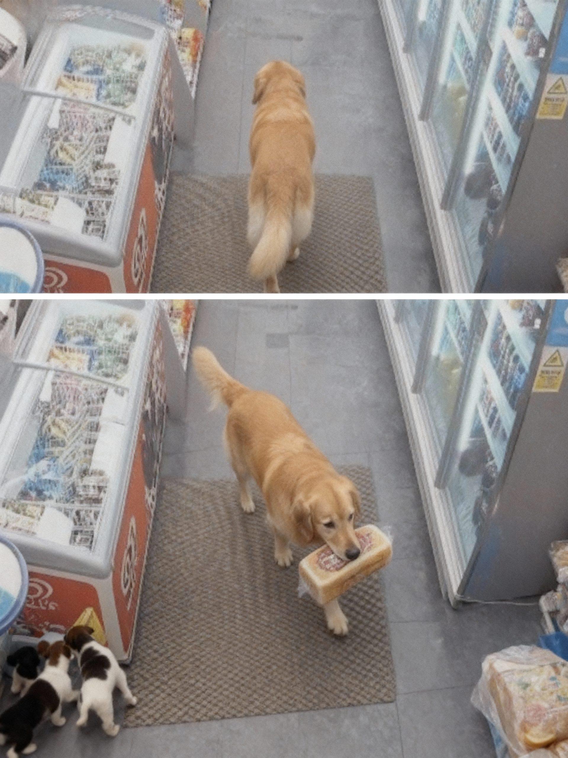 The flickering fluorescent lights of the convenience store usually cast a predictable glow over aisles of packaged goods, but one particular late evening, they illuminated a scene that would soon captivate hearts worldwide. It wasn’t the usual human customer perusing for a midnight snack, but a golden-furred stray dog, her gaze sharp and determined. Security footage, initially reviewed as a routine check, captured her slipping through the automatic doors with an almost unsettling stealth. She didn’t sniff around for scraps; instead, she moved with a purpose, her eyes fixed on the bread aisle. This wasn’t a random wanderer; this was a mother on a mission, driven by an instinct far more powerful than fear of discovery or hunger for herself. Her target: a single, untouched loaf of white bread. The sheer audacity of her silent infiltration, combined with the precision of her ‘heist,’ would soon reveal a story far deeper than mere canine mischief.