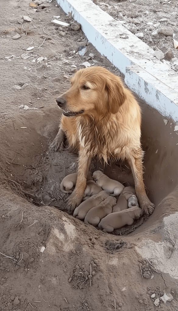 In a world that often seems filled with chaos and indifference, stories of unwavering love and resilience shine through, reminding us of the profound bonds that exist, even in the most challenging circumstances. This powerful image captures one such moment: a golden retriever, her fur matted with mud, her eyes reflecting a mixture of exhaustion and fierce protection, sitting diligently beside her newborn puppies in a makeshift, muddy den. It’s a stark portrayal of motherhood, stripped of any comforts, yet overflowing with an primal instinct to nurture and safeguard her vulnerable litter. Every drop of mud, every strand of wet fur, tells a tale of struggle, sacrifice, and the unbreakable spirit of a mother determined to provide for her young, no matter the adversity. This isn’t just a photograph of a dog and her pups; it’s a testament to the universal language of love and survival that resonates deeply within us all.
