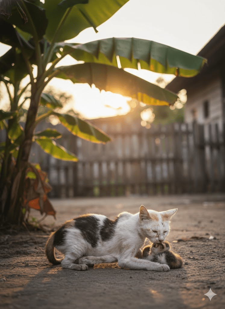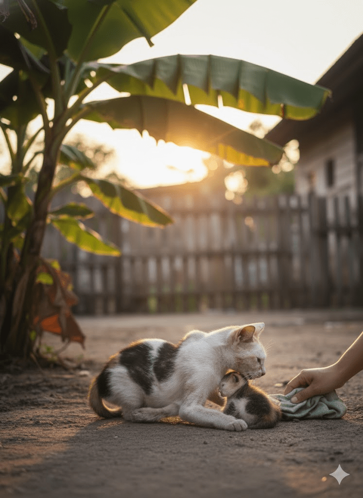 The world often presents us with scenes that tear at the heartstrings, moments of vulnerability that underscore the fragile dance of life and survival. It was an ordinary evening that took an extraordinary turn, unveiling a testament to the raw, unwavering power of maternal love. Under the gentle sway of a banana tree, a sight unfolded that would forever be etched into the memory of an observer: a mother cat, her once lustrous fur now patchy and dull from disease, her leg cruelly broken, lay beside her tiny kitten. The little one was tragically still, a chilling testament to life’s harsh realities. Yet, even in the throes of her own suffering, the mother leaned in, a soft, almost imperceptible murmur escaping her lips as she tenderly licked her baby’s head. It was a silent plea, a whispered prayer: “Wake up, my dear… Mama’s here.” With a paw, she instinctively tried to shield her motionless offspring from the evening breeze, a poignant gesture of protection against an indifferent world. The air hung heavy with a mix of despair and an enduring, desperate hope.