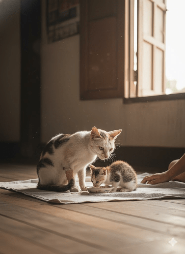 The journey to recovery was fraught with challenges, a daily battle against the lingering shadows of neglect and illness. Yet, with each passing day in their new, safe haven, both mother and kitten began to mend. The broken leg slowly healed, the fur started to regrow, and the hollow fear in their eyes gradually softened into trust. But it was the mother’s unwavering dedication that truly captivated. Despite her own weakened state, she consistently demonstrated a selflessness that brought tears to the eyes, always deferring to her kitten, ensuring the little one ate first, drank first. Her sharing was not born of abundance, but of an endless, wellspring of love that transcended her own needs.