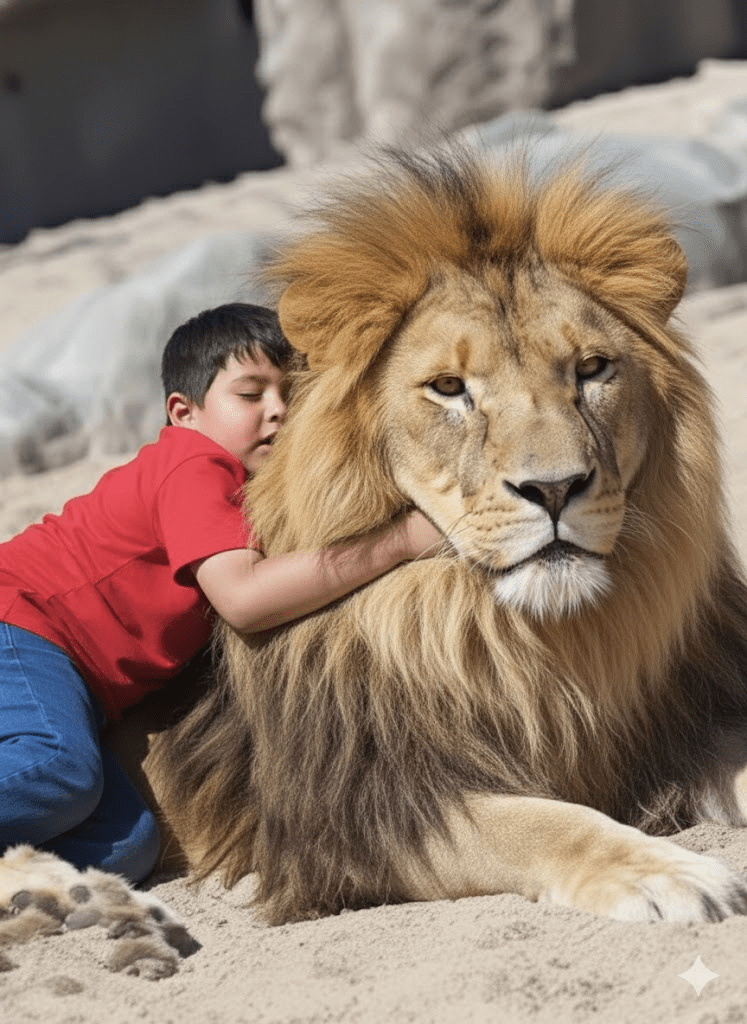 What happened next defied all logic and expectation. Leo reached the majestic beast, and with the innocent confidence only a child could possess, he leaned in, wrapping his slender arms around Kwan’s immense, shaggy mane. He pressed his face against the lion’s fur, whispering softly, a sound indiscernible to the terrified onlookers, yet seemingly understood by the ancient hunter. For nearly a minute, they remained in this extraordinary tableau – a predator and a child, in an embrace that transcended the wild and the tame.