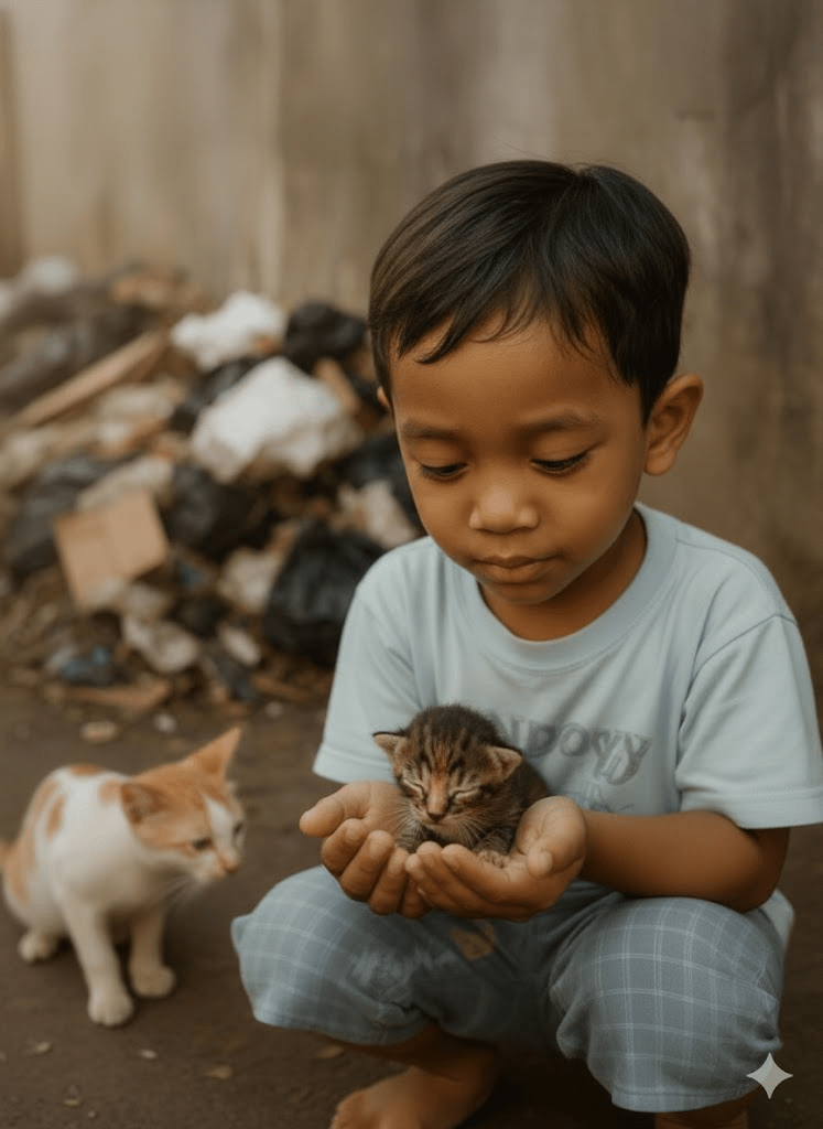 In the quiet, often overlooked corners of the bustling city, where the rhythm of life beat a little differently, a young boy named Azzam became an unlikely beacon of hope. His days, unlike those of many children his age, were not filled with toys and carefree play. Instead, they were marked by a quiet determination and an extraordinary sense of responsibility. Each morning, armed with a small bowl of rice, a treasure carefully prepared from his family’s modest meals, Azzam would venture to a dusty alleyway, a place where the forgotten feline residents of the city congregated. He wasn’t just feeding stray cats; he was nurturing a fragile ecosystem of kindness, a testament to the enduring power of compassion in the face of hardship. The world around him might have been indifferent, but in Azzam’s gentle eyes, every life held value, every creature deserved a moment of solace and sustenance. This simple, daily ritual was more than just an act of charity; it was a silent, powerful rebellion against the harsh realities that often define the lives of both humans and animals in the city’s underbelly.
