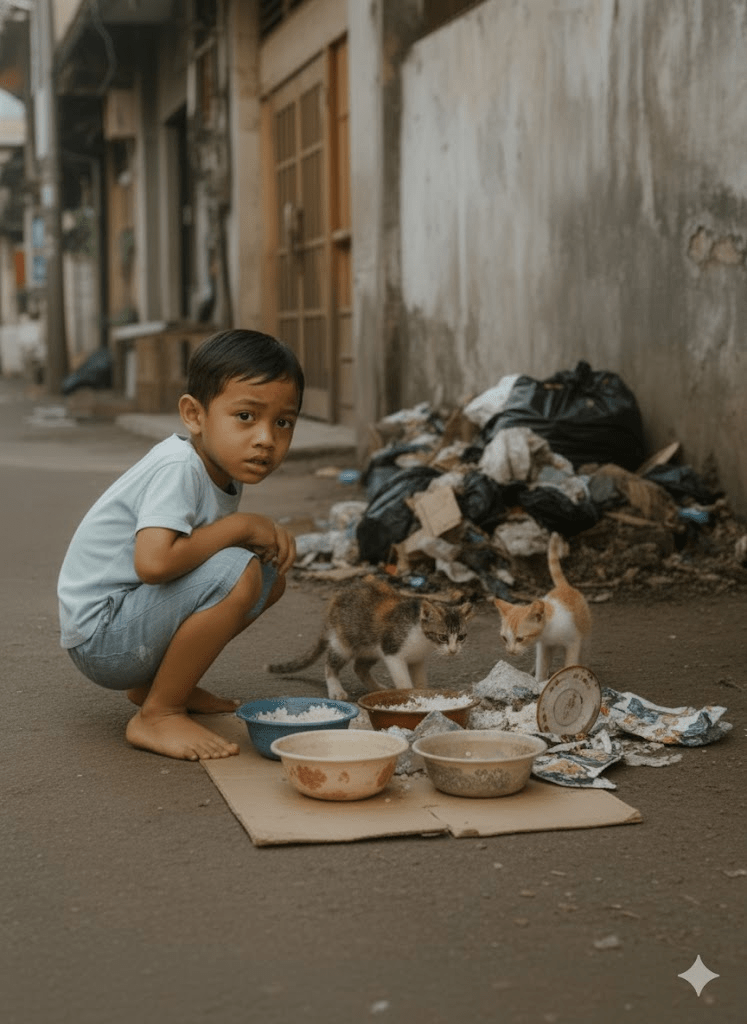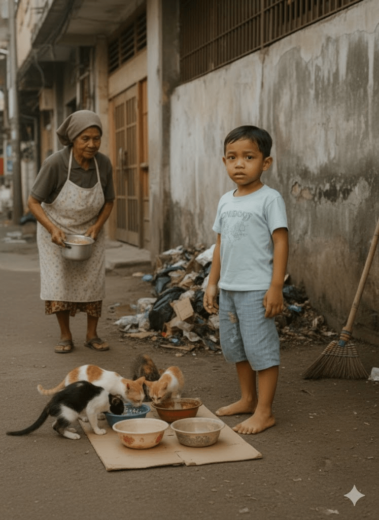 In the bustling heart of a nameless city, amidst the cacophony of daily life and the often-overlooked corners where shadows dance with refuse, a small figure emerged daily, a beacon of unwavering kindness. Azzam, a boy whose tender age belied the depth of his spirit, became a silent guardian of the forgotten, the stray cats that roamed the urban fringes. Each morning, armed with a simple bowl of rice, a testament to his family’s modest means yet boundless generosity, he would seek out his feline companions. His routine was a quiet rebellion against indifference, a daily affirmation that even in the toughest environments, compassion could flourish. The stray cats, initially wary, had come to recognize his silhouette, their cautious anticipation a mirror to his gentle smile. This ritual, seemingly ordinary, was about to unravel into a series of events that would challenge Azzam’s resolve, test the community’s conscience, and ultimately, reveal the profound impact of a child’s pure heart.
