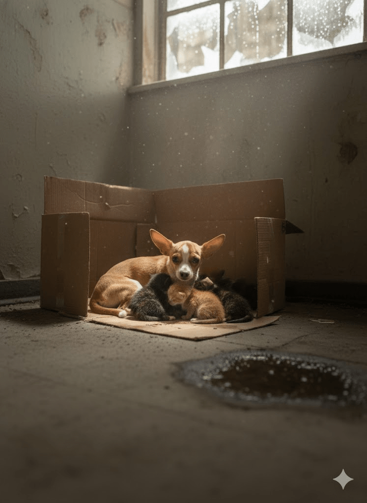 Her unexpected meal provided a temporary reprieve, but her struggle was far from over. Days blurred into nights, each bringing new challenges. One evening, a sudden downpour began, water seeping through the dilapidated roof. Gina, seeking shelter, stumbled upon a small, dry corner, only to find a litter of abandoned kittens huddled together, mewling weakly. Despite her own precarious state, an innate maternal instinct, perhaps born from her own vulnerability, compelled her to lie down with them, offering what little warmth her emaciated body could provide.