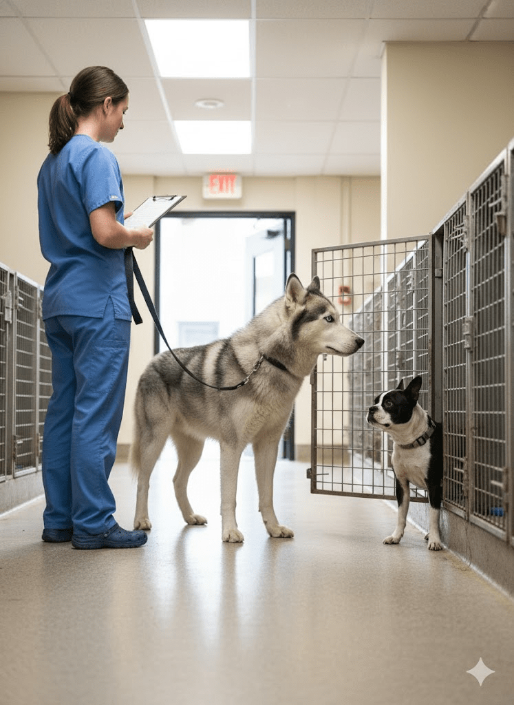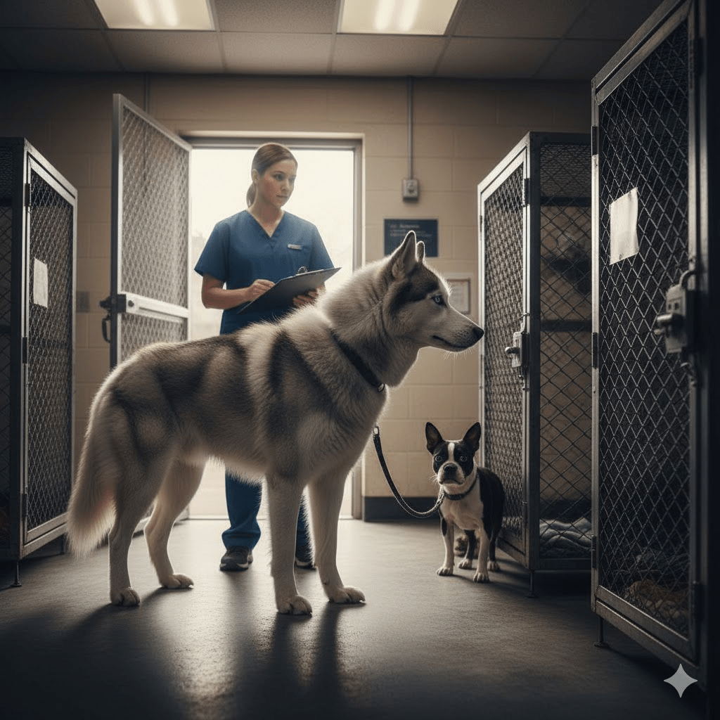 My gaze followed his, and that’s when I saw him: Hades, a tiny black-and-white Boston Terrier, peeking out from the farthest corner of Zeus’s old run. His anxious eyes trembled, fixed on the Husky. It dawned on me then – they weren’t just kennel mates; they were friends, a source of comfort and familiarity in a world of uncertainty. Zeus wasn’t just leaving a cage; he was leaving his only sense of safety, his companion. A deep, almost palpable tenderness filled the air, a silent plea from one animal to another.