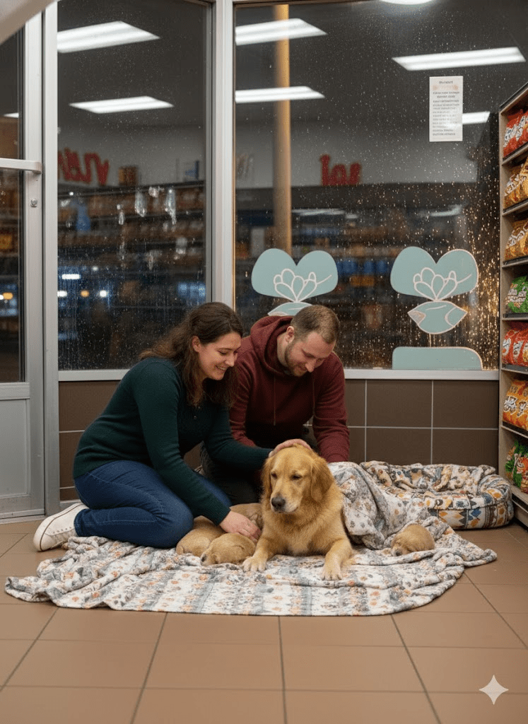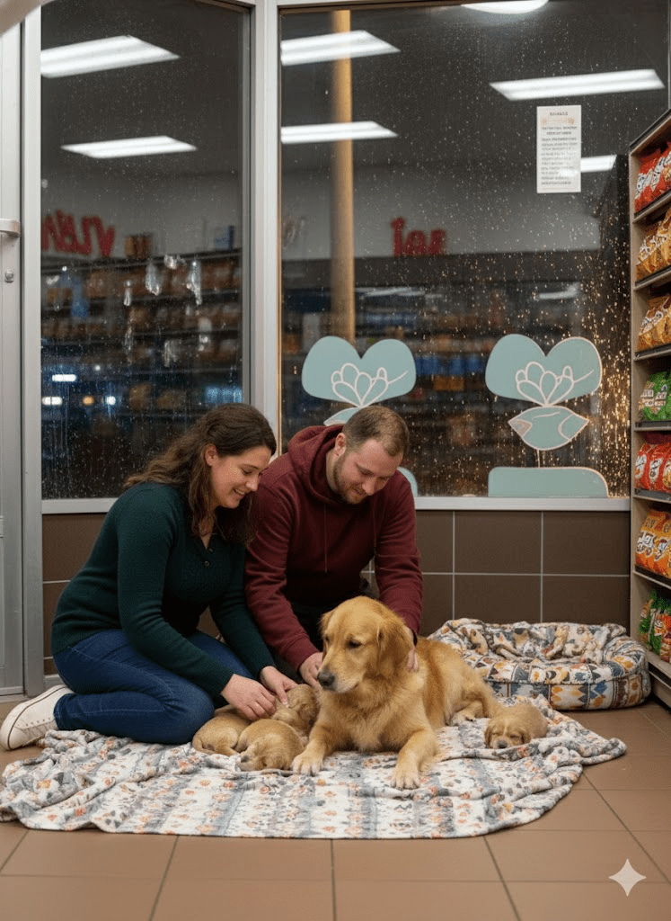 On March 14, 2025, security cameras outside Mark and Anna’s corner store captured the now-famous footage: a golden retriever, battered by the rain, meticulously carrying her newborn puppies to the store’s overhang. One by one, she moved her fragile cargo to safety, then curled around them, a picture of weary devotion. Inside, as Mark prepared to close, he saw the scene unfold. His immediate call to Anna was met with an unequivocal directive: “Let them in.” What followed was a tender procession as the mother dog, with gentle encouragement from Mark and Anna, carefully brought her entire litter into the warmth of the store, where soft blankets awaited.