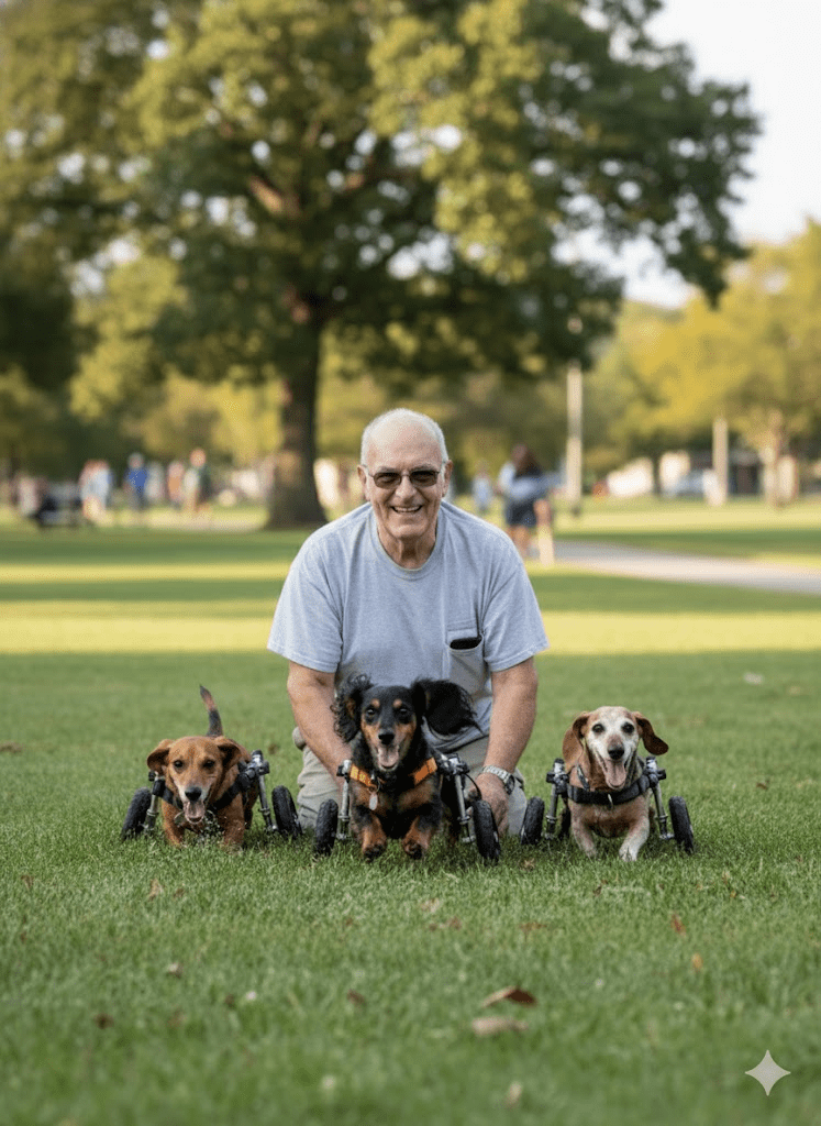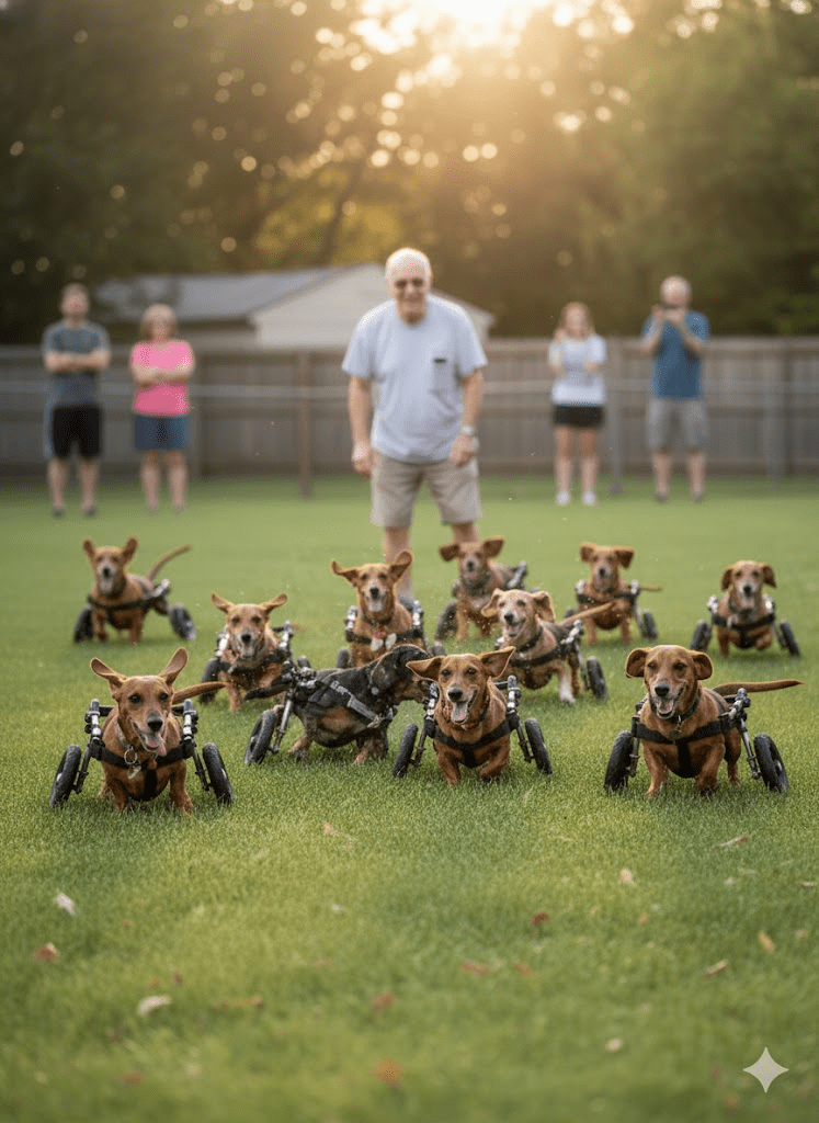 In a quiet, tree-lined neighborhood, a remarkable sight unfolds every morning as the sun casts long shadows across the pavement. Gregory Lane, a man whose unassuming demeanor belies a heart of immense compassion, embarks on his daily ritual. He pushes a modified stroller, not filled with infants, but with a lively crew of canine companions. These aren’t just any dogs; they are his beloved rescues, each one paralyzed and missing the use of their back legs. Some bear the scars of devastating accidents, hit by cars and left for dead. Others were cruelly abandoned, their spirits nearly broken by neglect. All of them, without exception, had been given up on by society, deemed beyond help – until they met Gregory. Known affectionately by locals as “the dog dad with the wheels,” Gregory’s journey began years ago, a serendipitous encounter that would forever alter the course of his life and the lives of countless animals.