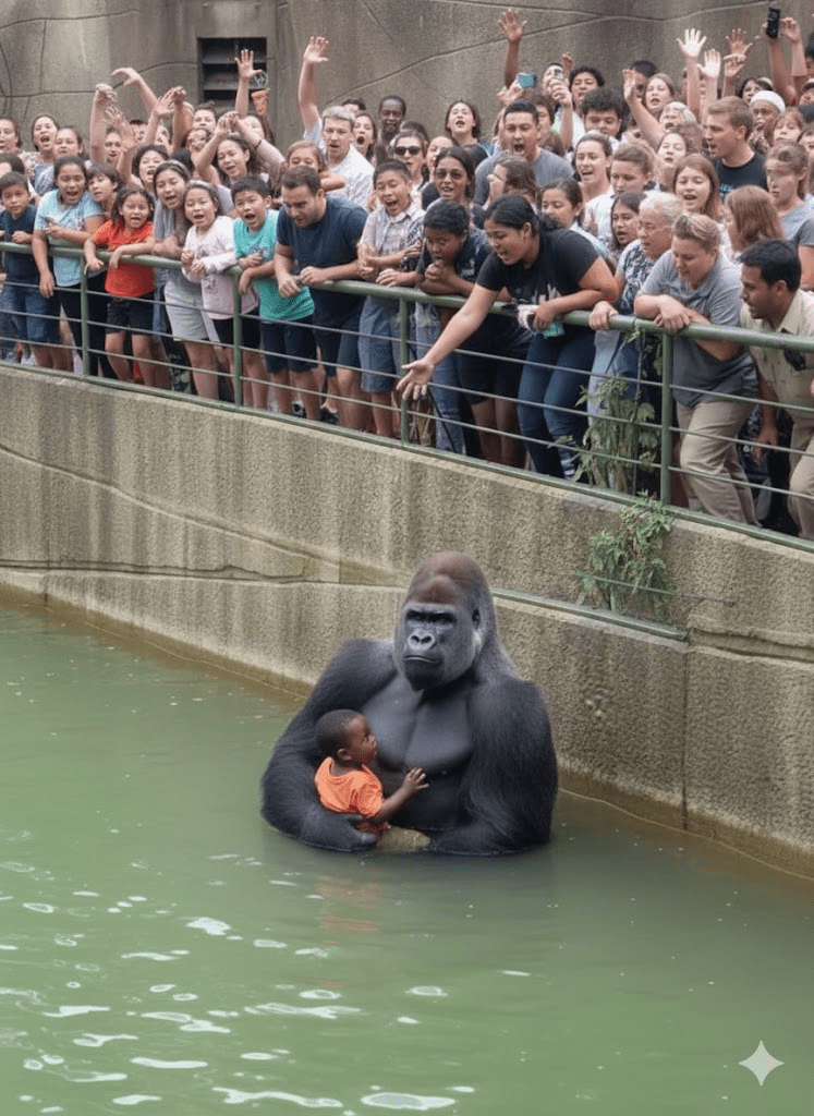 The tranquility of a sunny Saturday afternoon at the city’s renowned zoological park was shattered by a collective gasp, quickly escalating into screams of panic. Families, enjoying a leisurely stroll, watched in horror as a routine visit transformed into a heart-stopping nightmare. A young child, momentarily out of a parent’s grasp, had slipped over the safety barrier of the gorilla enclosure, plummeting several feet into the watery moat below. The immediate aftermath was a cacophony of fear—parents clutching their children tighter, onlookers pointing in disbelief, and zoo staff rushing towards the scene, their faces etched with grave concern. All eyes turned to the enormous silverback gorilla, normally a majestic and serene presence, now the unwitting focus of a dire emergency.