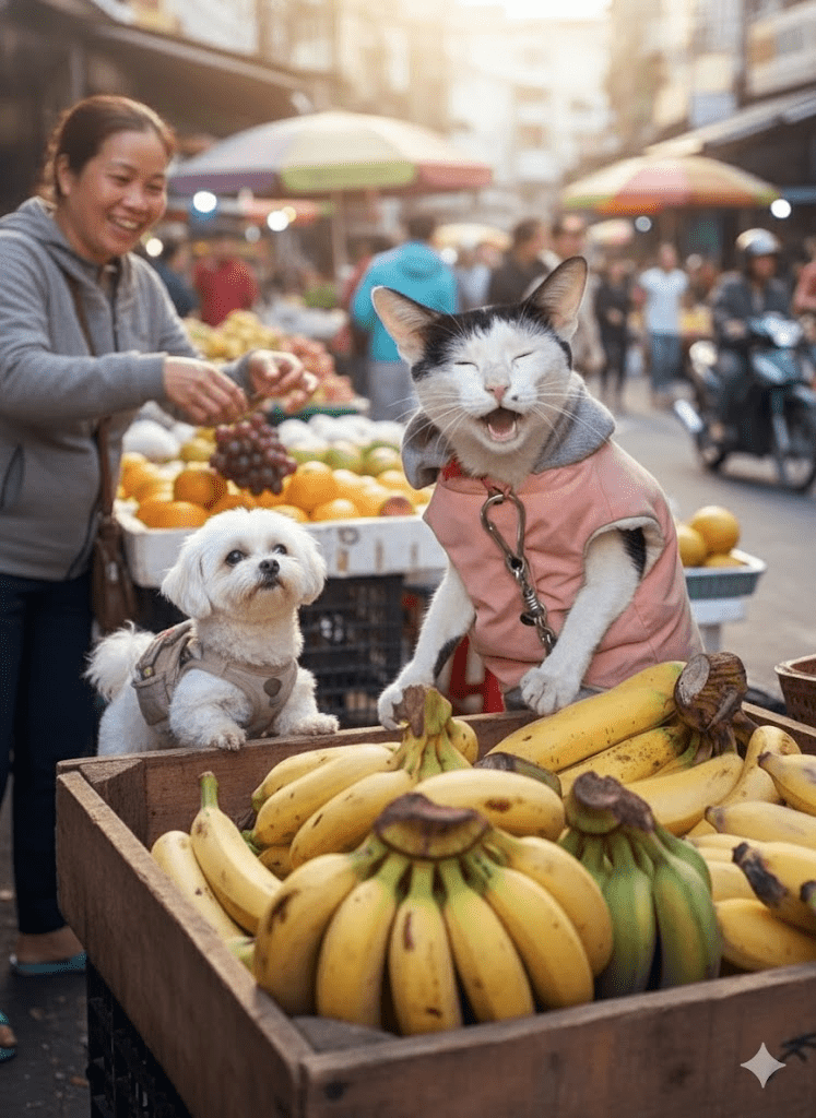 In the bustling heart of Hanoi’s Old Quarter, where the scent of pho mingles with the exhaust of motorbikes, a legend was quietly unfolding. It wasn’t a tale of ancient emperors or wartime heroes, but of a small, fluffy, and unexpectedly shrewd entrepreneur named Mr. Meownana. For years, the fruit stall at the corner of Hang Be and Gia Ngu streets was just another colorful blur in the urban tapestry. That was until Mr. Meownana, a black-and-white feline with an unshakeable grin and an undeniable flair for dramatics, took over the management. Dressed in his signature pink jacket, a sartorial choice that initially raised eyebrows but quickly became his brand, he transformed a mundane banana stand into the most talked-about retail experience in the city. His days were a whirlwind of guarding his precious produce, engaging in what could only be described as spirited negotiations with human and canine customers alike, and occasionally, to the delight of onlookers, “overcharging” the neighborhood dogs for a sniff of his ripe offerings. His motto, delivered through a silent, ear-to-ear smile, seemed to be, “Buy two bunches, and I’ll throw in a free meow!” This wasn’t just a fruit stall; it was a stage, and Mr. Meownana, with his infectious laughter and commanding presence, was its undisputed star.