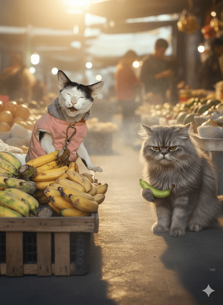 The first twist in Mr. Meownana’s rise to fame came not from his charming antics, but from a sudden, unexplained shortage of ripe bananas across the city. Competitors fretted, customers grumbled, but Mr. Meownana’s stall remained miraculously well-stocked. Whispers started in the market: Was he secretly importing them? Did he have a hidden banana farm? The truth, it turned out, was far more feline. A rival vendor, Mr. Pawsalot, a grumpy Persian from the next street over, was caught red-pawed trying to sabotage Mr. Meownana’s supply chain by “misplacing” several crates. Mr. Meownana, ever vigilant, had anticipated the move and had secured a secret, pre-dawn delivery, ensuring his shelves remained abundant and his smile, unyielding.