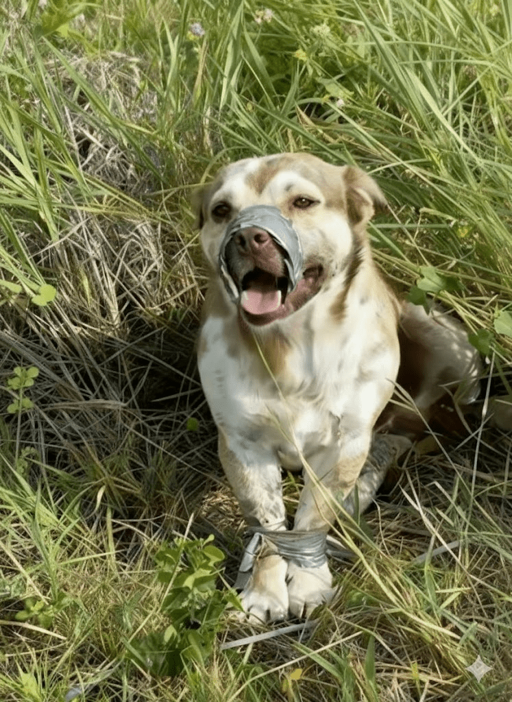 The image of a dog, its muzzle bound with tape and its paws similarly restrained, sitting amidst tall grass, speaks…