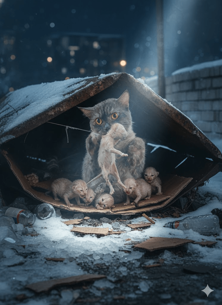 The biting wind howled through the narrow alleys, a cruel symphony to the silent struggle unfolding in the heart of a merciless winter night. For Rosie, a scruffy stray cat whose life was a continuous dance with hunger and frostbite, this night was different. Tucked away beneath a collapsing dumpster, her tiny, shivering brood of six kittens cried out, their fragile lives flickering against the brutal cold. Rosie, her own body aching and starved, knew a terrible truth: they wouldn’t last the night. Every instinct screamed at her to protect them, to find warmth, sustenance, hope – a hope that seemed as distant and cold as the stars above. It was a desperate gamble, a choice between certain doom in their hidden den and the terrifying unknown of seeking help from the very creatures who had often shown her only indifference or cruelty. But as she nudged her weakest kitten, feeling its shallow breath, a fierce, unyielding resolve ignited in her amber eyes. She would not let them perish. Not tonight.