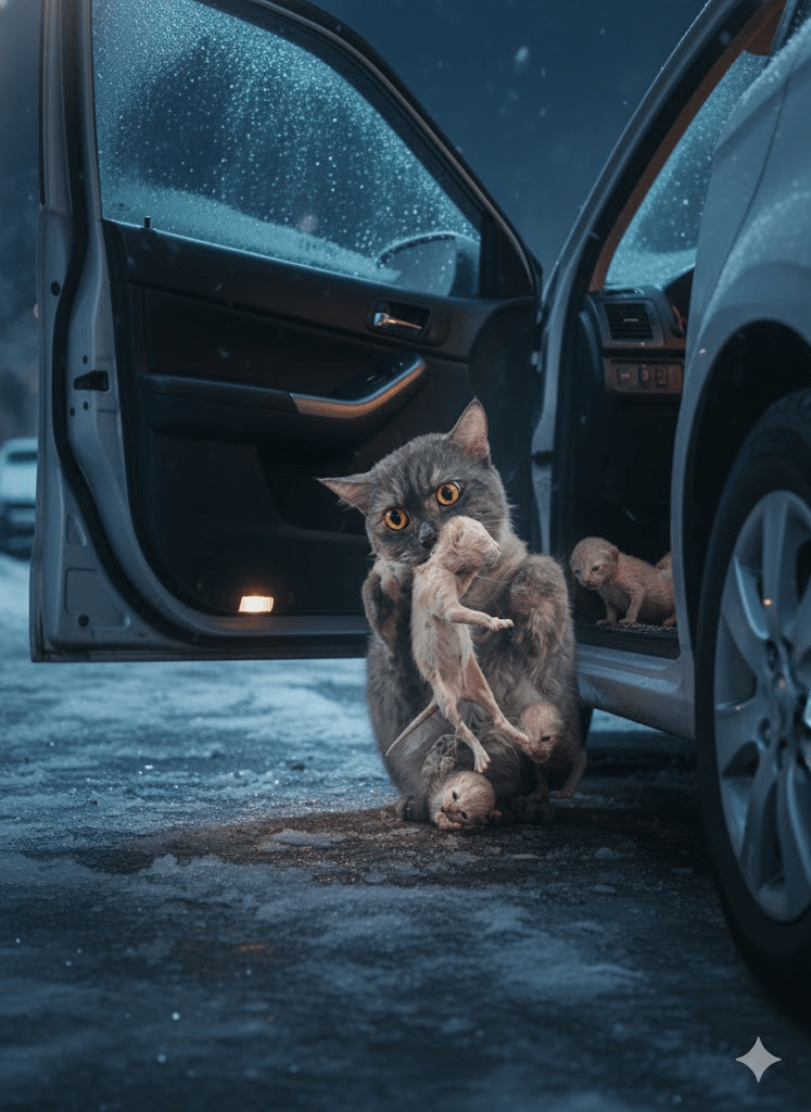 Driven by an unimaginable maternal ferocity, Rosie began her perilous journey. One by one, she gently but firmly carried her kittens, not towards a safer hiding spot, but towards the faint glow of streetlights where human activity was more frequent. It was a terrifying exposure, her heart pounding with every shadow and every distant sound. Finally, she spotted it: a parked car, seemingly abandoned, yet radiating a hint of warmth from its recently run engine. With a cautious approach, she began her extraordinary plea.