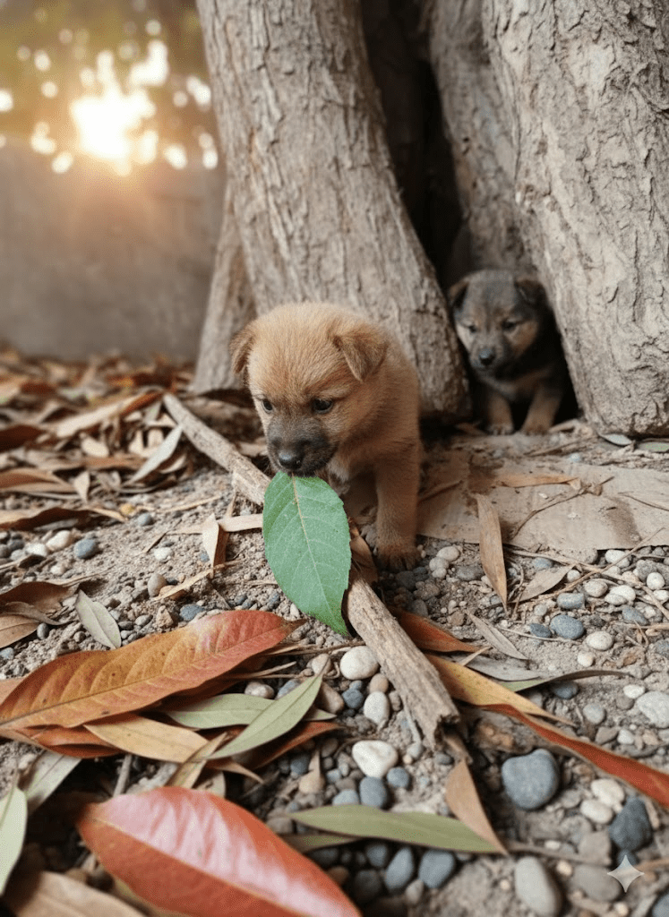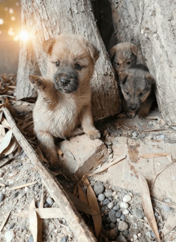 The late afternoon sun, filtered through the sparse canopy of an old, gnarled tree, cast long, dancing shadows across the dusty ground. It was in this humble, almost forgotten corner that a remarkable scene unfolded, a vignette of nascent courage and quiet observation. A tiny, ginger-furred puppy, no more than a few weeks old, stood poised, one paw tentatively raised, a silent greeting to a world it was only just beginning to comprehend. His dark, curious eyes, full of a boundless wonder unique to new life, surveyed his immediate surroundings – a scattering of dry leaves, smooth river stones, and the rough, welcoming bark of his temporary sanctuary. From the shadows of a hollow beneath the tree’s ancient roots, two more sets of eyes, equally wide with innocent trepidation, peered out. These were his siblings, still bound by the comforts of their makeshift den, yet undeniably drawn by their brother’s audacious venture. This wasn’t merely a moment of exploration; it was the unfolding of a narrative, a whisper of courage in the face of the unknown, and a profound reminder that even the smallest steps can lead to the grandest adventures. What began as a simple curiosity would soon transform into a journey none could have predicted, echoing the very essence of unexpected twists in the tapestry of life.
