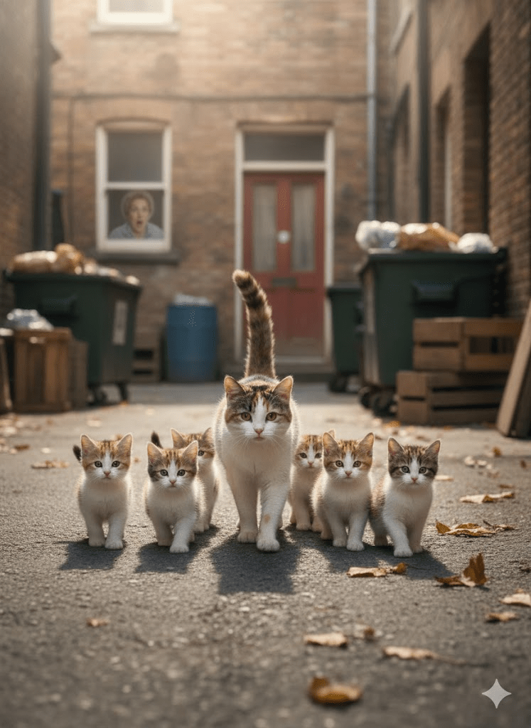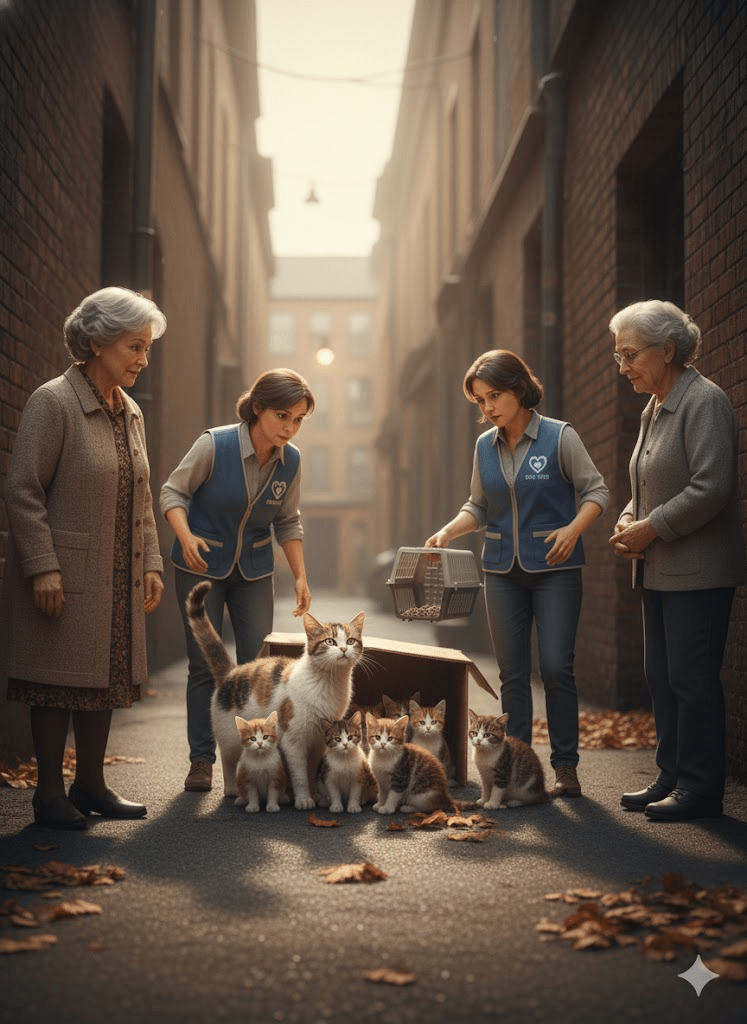 The small, forgotten alley behind Mrs. Henderson’s bakery had always been a quiet place, frequented only by the occasional delivery truck and the shadows of dusk. No one expected it to become the stage for a story of resilience, unexpected twists, and profound community spirit. It all began on a crisp autumn morning when a scrawny calico cat, her fur matted and her eyes holding a weary wisdom, emerged from the labyrinth of dumpsters. She was not alone. Trailing behind her, a miniature army of nine fluffy kittens, their tiny paws tentative on the rough asphalt, followed their mother’s every careful step. Mrs. Henderson, peering out her back door, gasped. She had seen stray cats before, but never a mother with such a formidable brood, each kitten a testament to a tireless fight for survival. This wasn’t just a sighting; it was an introduction to a drama unfolding, a narrative of maternal devotion playing out on the harsh streets, unknowingly poised to captivate and transform the lives of those who witnessed it.
