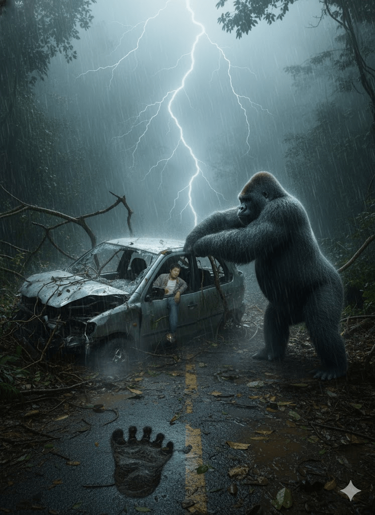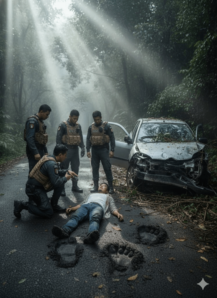 As dawn approached, piercing through the storm-laden canopy, a search party finally reached the crash site. What they discovered sent shivers down their spines: huge, non-human footprints pressed deep into the muddy earth around the wreckage. Rafi was found several feet from his demolished vehicle, bruised, bleeding, but miraculously alive and conscious. He mumbled incoherently about a “shadow” and “gentle hands.” The team, accustomed to the rational dangers of the jungle, struggled to reconcile his story with the scene before them. Was it delirium, or had something truly inexplicable occurred in the heart of the storm?
