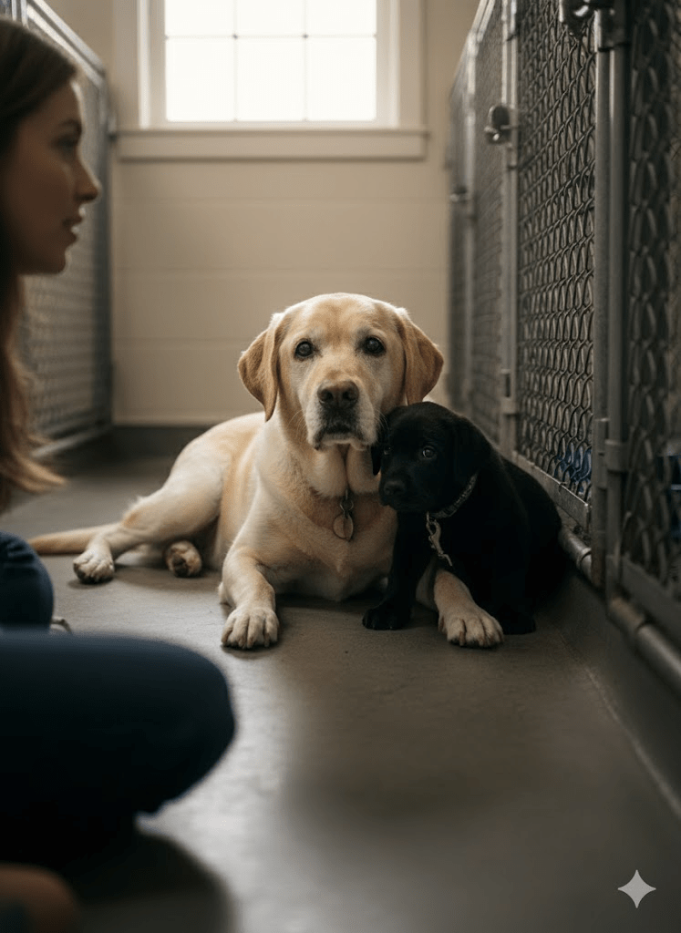The shelter on Maple Street was a place of last resorts, a temporary haven where wagging tails often hid sad stories. On a brisk Tuesday morning, a woman named Sarah walked through its doors, her heart set on adopting a single dog. She envisioned a quiet companion, perhaps an older, calmer soul. What she found instead was a story of profound loyalty and an unexpected twist of fate that would forever change her definition of family. Two dogs, an old, weary Labrador with a muzzle dusted in grey and a tiny, trembling black puppy, were huddled together in a single kennel. Their connection was immediate and undeniable, a silent promise whispered between two beings who had clearly weathered storms together. Sarah was about to witness a bond so powerful, it would not only challenge her initial intentions but also reveal the extraordinary capacity for love that exists even in the most broken of circumstances.