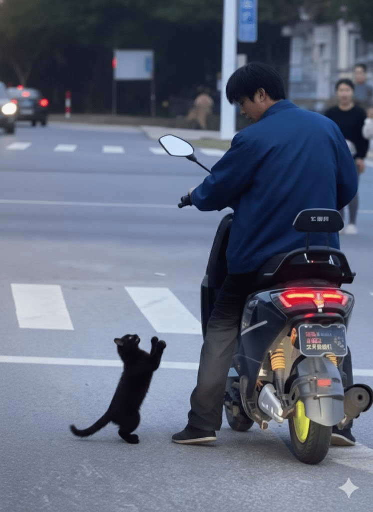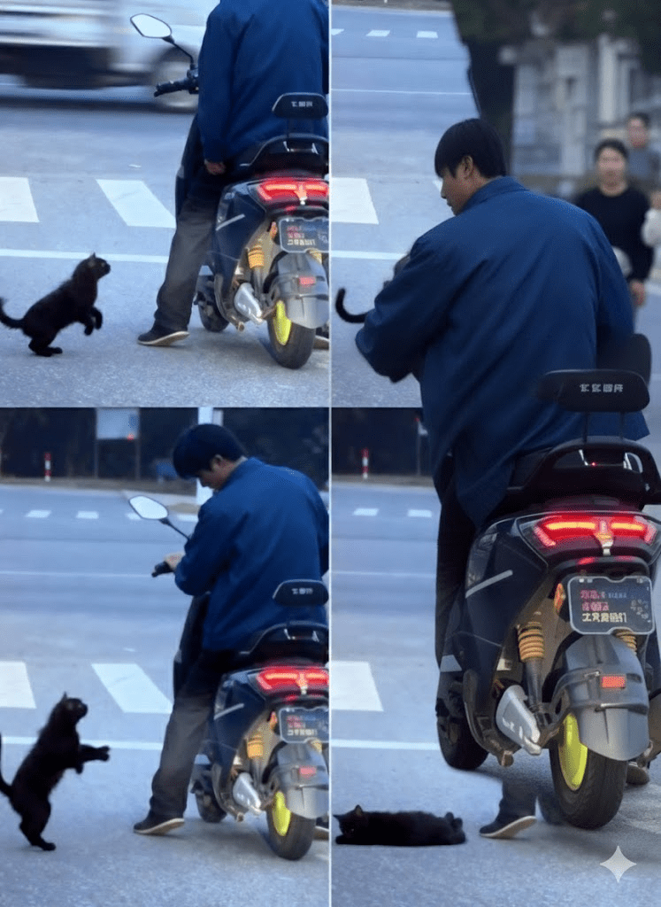 The hum of urban traffic, typically a monotonous backdrop to daily commutes, was momentarily silenced for a handful of onlookers at a bustling intersection. As the traffic light cycled to red, bringing a lone motorcyclist to a halt, an ordinary moment transformed into an extraordinary display of unexpected connection. From the periphery of the road, a small, sleek black cat emerged, not with the cautious trepidation typical of strays, but with an almost audacious determination. It weaved through the stopped vehicles, its eyes fixed on the motorcycle, as if drawn by an invisible thread of destiny. The rider, initially oblivious, soon became the focal point of an unscripted street drama that would melt the hearts of all who witnessed it.