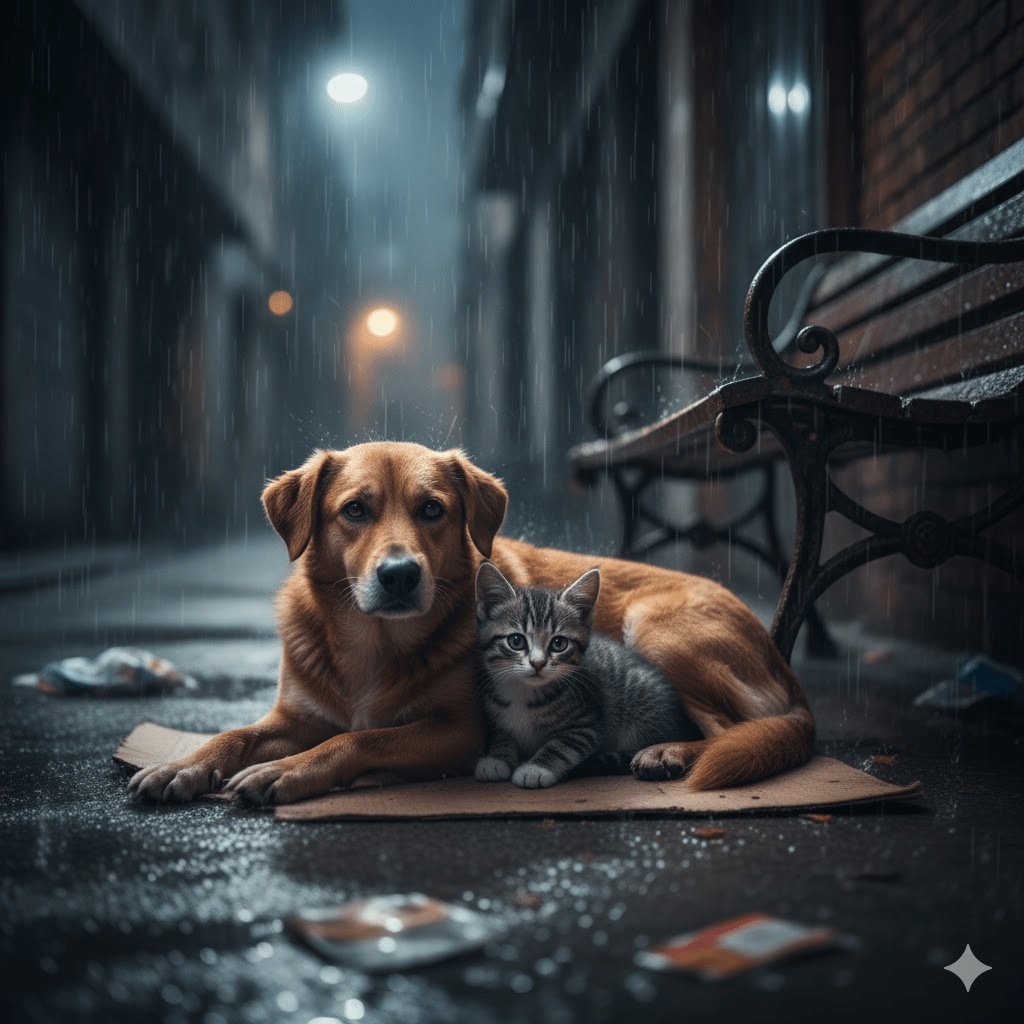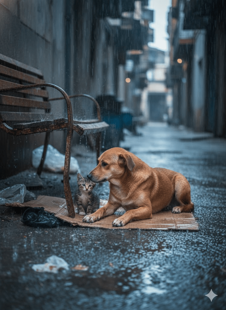 In the desolate alleys and forgotten corners of a bustling city, two souls, a scruffy stray dog named Bruno and a tiny tabby cat called Mimi, were locked in a daily battle for survival. Bruno, a once-loved family pet, found himself abandoned when his owners moved away, leaving him to navigate a world that had suddenly turned cold and unforgiving. Mimi, born into the harsh realities of street life, knew only scarcity and the constant threat of hunger. Their paths, by all accounts, should never have crossed, let alone intertwined in a bond so profound it would captivate the hardened hearts of onlookers. But fate, with its often-cruel sense of humor, had other plans for these two unlikely companions.
