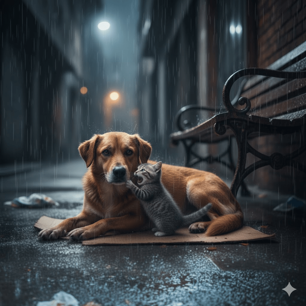 It was a relentless, rain-soaked evening when their worlds collided. Bruno, seeking meager shelter under a tattered awning, spotted Mimi, a tiny bundle of shivering fur, huddled beneath a broken park bench. The instinct to survive often makes street animals wary, even hostile, towards others, but Bruno’s gentle spirit defied the grim realities of his existence. Instead of walking past, he lay down beside her, offering the only warmth he had. From that pivotal moment, an unspoken pact was forged, a bond that transcended species and the brutal hierarchy of the streets. They became inseparable, their survival intertwined.