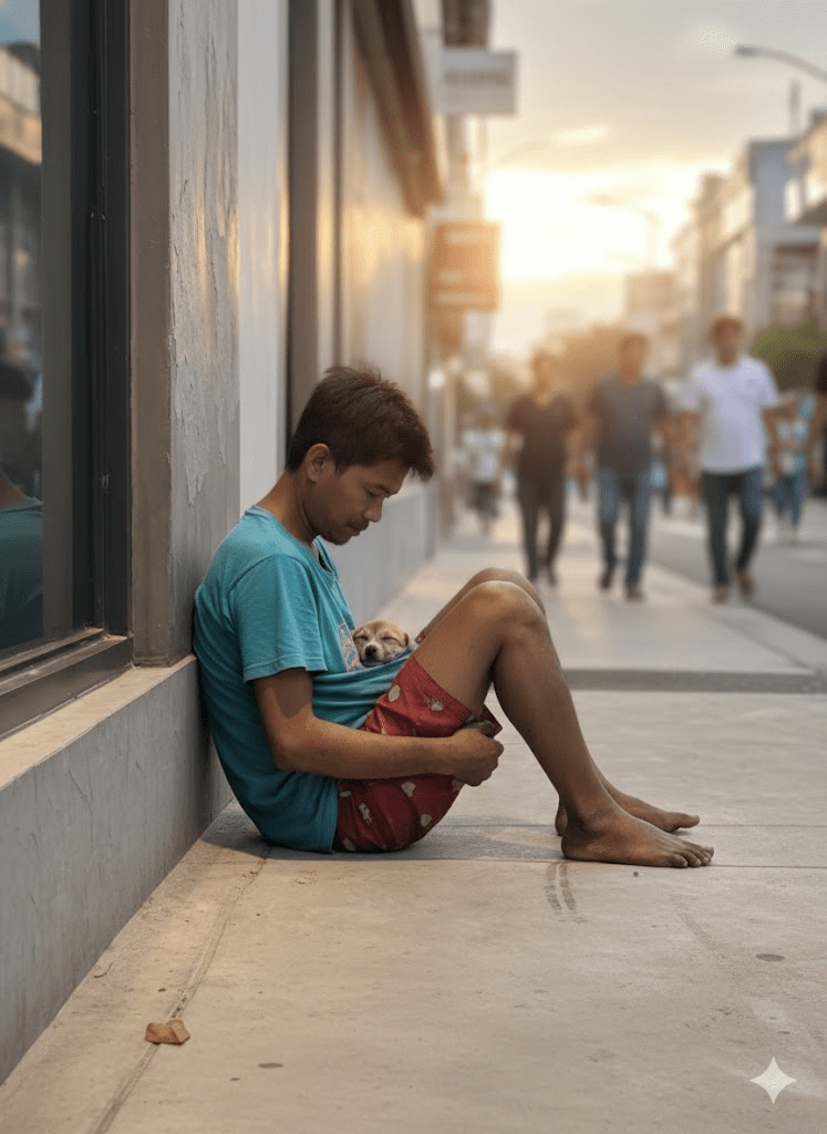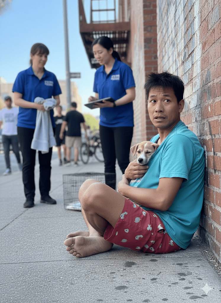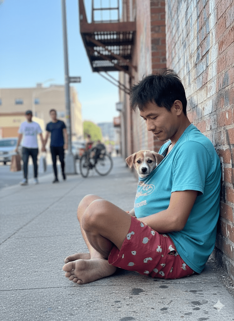 The city street hummed with its usual indifferent rhythm, each passing car and hurried pedestrian a testament to a world often too busy to notice the quiet dramas unfolding in its margins. It was against this backdrop that a scene of profound, unspoken devotion played out daily, largely unseen, on a cold stretch of sidewalk. He lay there, a man stripped of most worldly possessions, his only comfort a worn blue shirt. Yet, within the folds of that humble garment, nestled close to his heart, was a tiny, beating life – a small dog, equally threadbare, but rich in a love that defied the harshness of their shared existence. Their silent companionship was a testament to resilience, a beacon of warmth in a life otherwise devoid of it, where the world walked past, oblivious to the powerful, silent narrative of two souls clinging to each other for survival and meaning.