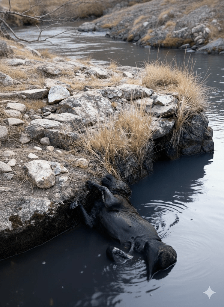 The creature, dark and imposing, lies partially obscured by the water, its form suggesting both strength and a profound stillness. The surrounding landscape, with its rugged rocks and sparse, golden grasses, hints at a wild, untamed environment where nature’s processes unfold without human intervention. This tableau speaks of the relentless cycle of life and the quiet dignity of existence within the wilderness.